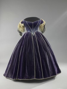 Mrs Lincoln was somewhat of a fashionista known for her sense of style, opulent fashions and jewellery. Cost was not a factor when it came to selecting jewellery and having her gowns designed to her requirements. One of her most extravagant gowns, made by Elizabeth, is a purple velvet ball gown worn during the winter 1861/62 social season. The bodice is piped with white satin and trimmed with mother-of-pearl buttons and like most gowns of the period, it featured both a daytime as well as an evening bodice. The gown is now part of the Smithsonian Institutes First Ladies Collection.