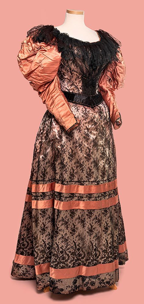 eep rose pink and black silk lace dress with full gigot (leg-of-mutton) sleeves was created for the trousseau of Miss Sara C. Simonds in January 1890.